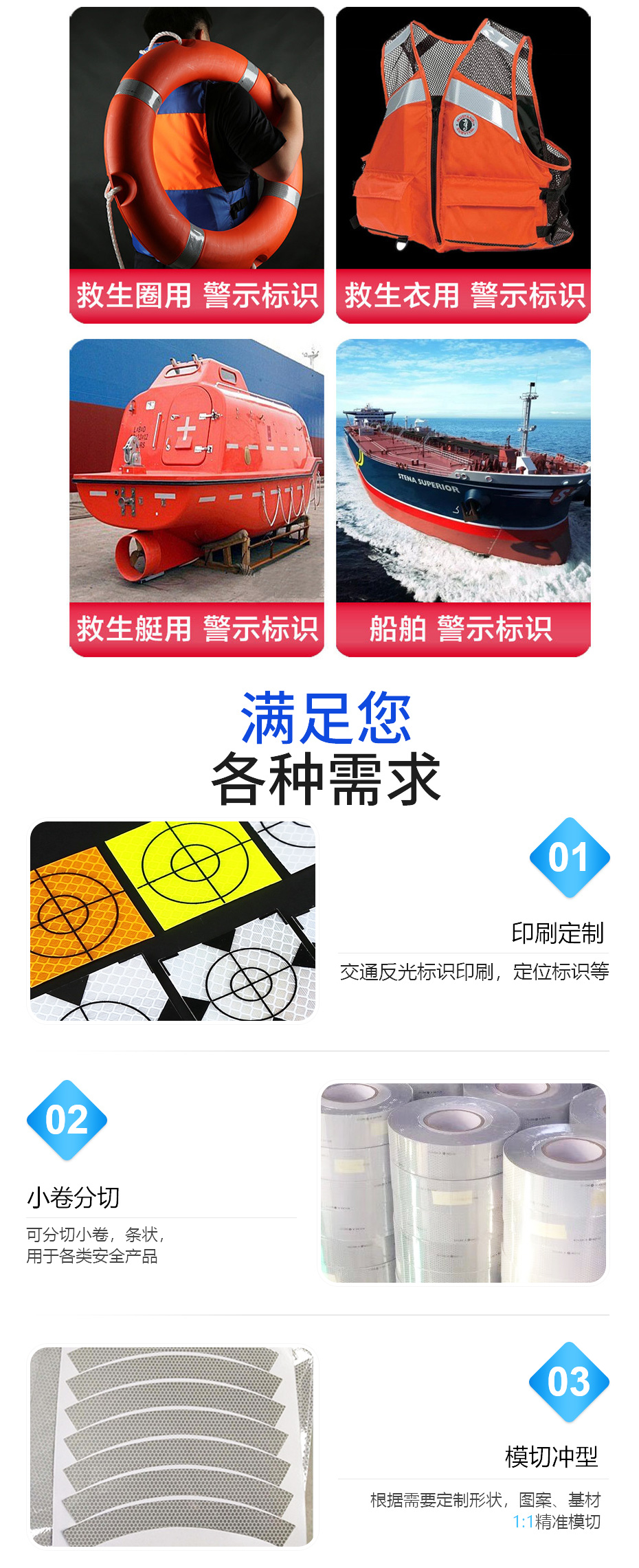 【產品特性】耐候性好,-40°+80°反光性能穩定,用於船舶,救生艇,救生衣,海上救生用品等。