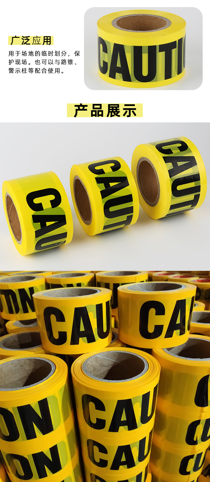 【產品(pǐn)特性】警(jǐng)示明顯,抗拉耐磨(mó),不留殘膠;應用於施(shī)工現場,物(wù)品定位,安全警(jǐng)示,生產車間(jiān)區域劃分等